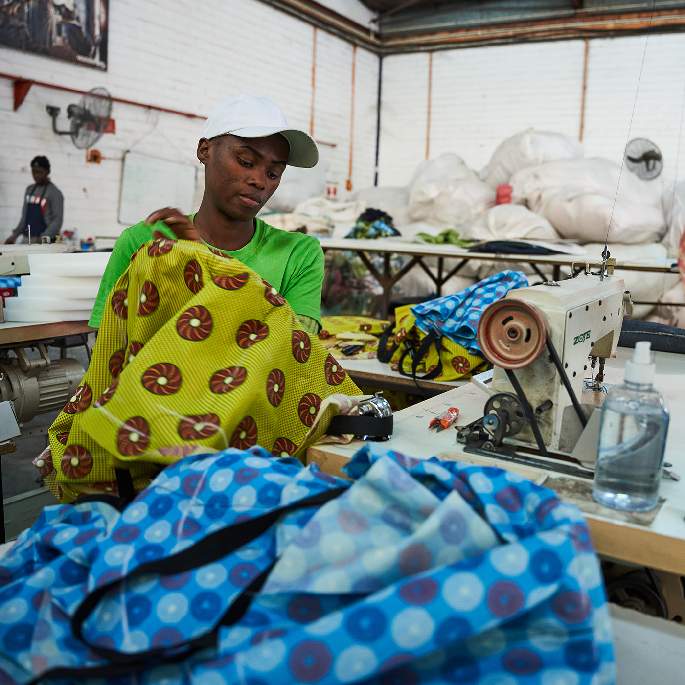 In addition, rather than having one large production centre for our bags, we have ‘Centres of Excellence’ which we use as training centres for our entrepreneurial production hubs, which are based out of communities. This helps to create work, promote entrepreneurialism, and boost economic growth in many communities, rather than just the one.